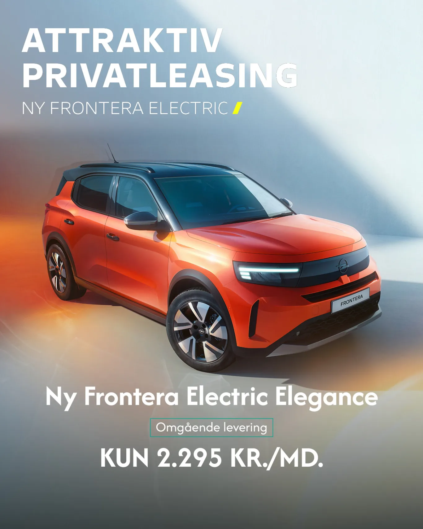 Forbrug**: 17,6 kWh/100 km. Rækkevidde* 306 km. Halvårlig grøn ejerafgift 420,-. Ladetid: V/max-effekt 11 kW 20-80% ned til 2 t. 50 min. V/max-effekt 100 kW 20-80% ned til 26 min. Privatleasing v/Jyske Finans A/S. Mindstepris i bindingsperioden (12 mdr.) 36.885,- inkl. afleveringsgebyr 1.150,-. Prisen er ekskl. ekstraudstyr, dækaftale, forsikring, brændstof og grøn ejerafgift. Kaskoforsikring, positiv kreditgodkendelse og betaling via Betalingsservice forudsættes. V/periodens udløb returneres bilen til Jyske Finans A/S. Aftalen kan opsiges m/varsel på 1 md. til udgangen af en måned, 11 mdr. efter indgåelse. Bil kan være vist med andet ekstraudstyr. Prisen gælder til 31.12.25, så længe lager haves og ved indregistrering i 2025. **Påvirkes af kørestil, ekstraudstyr mv.